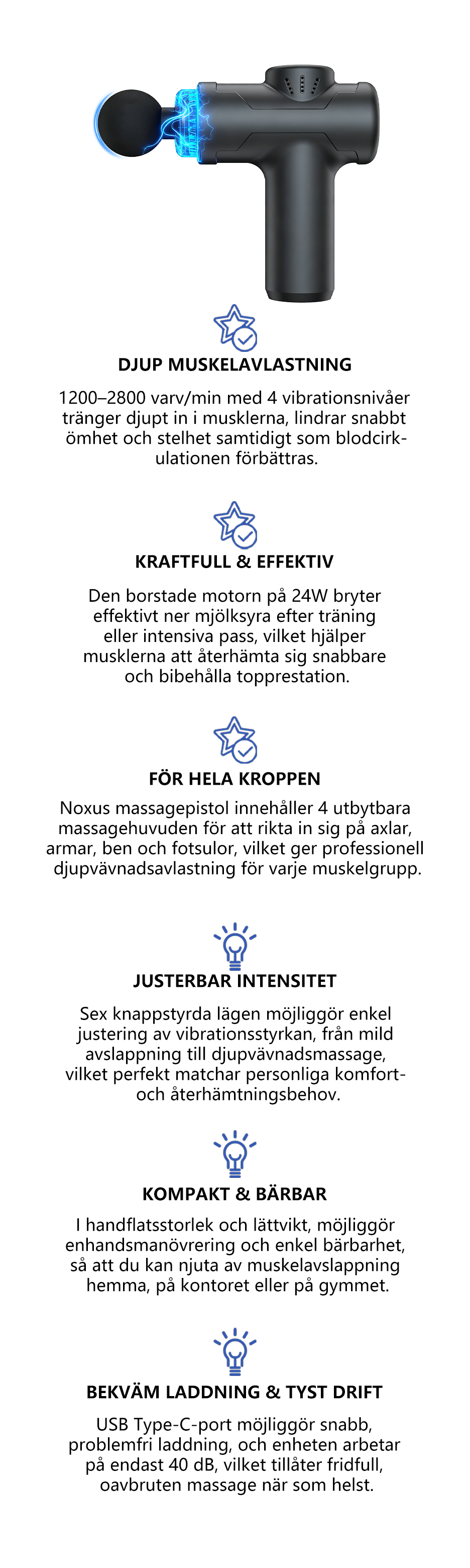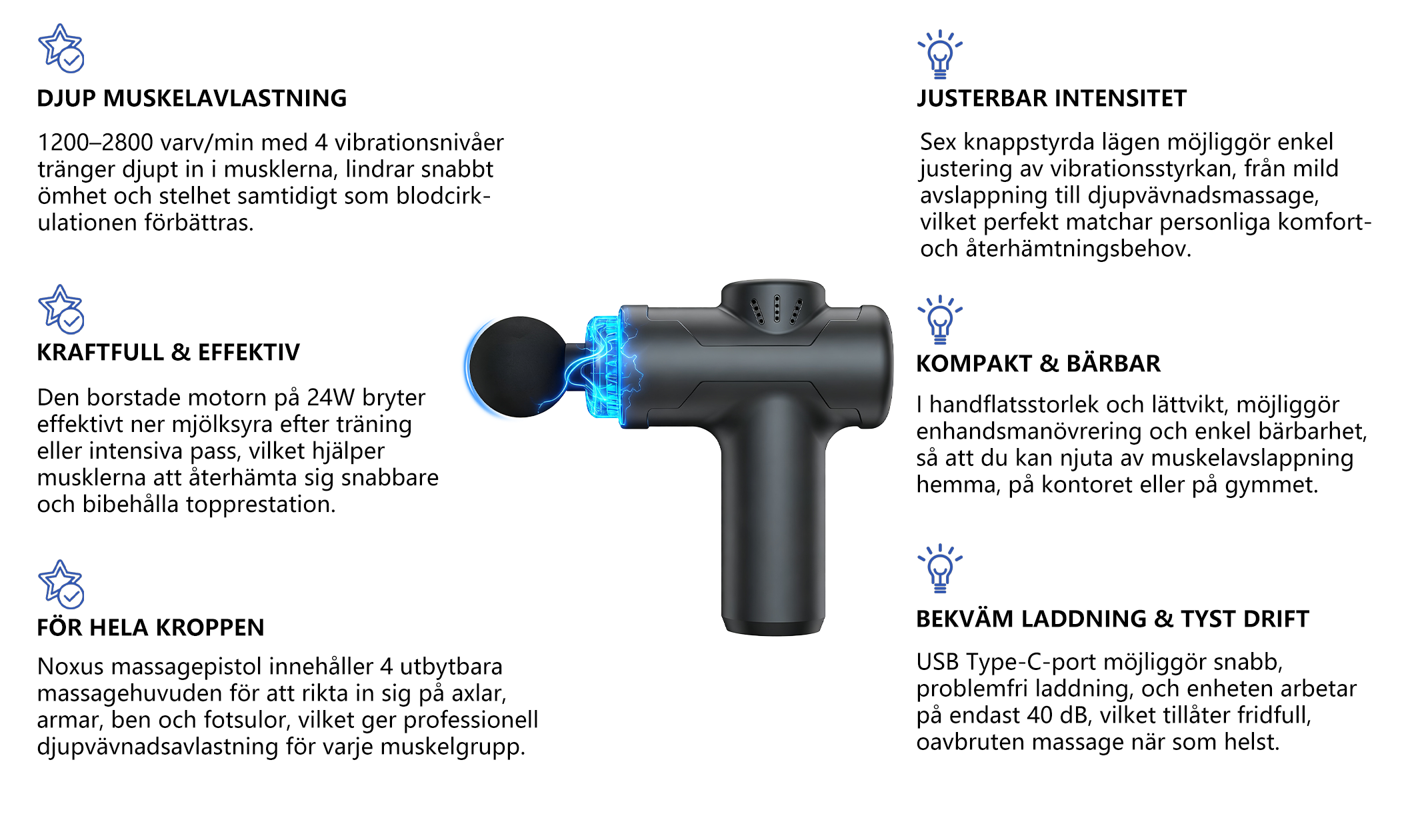 Noxus levereras med fyra utbytbara massagehuvuden som är anpassade för hela kroppen – från nacke och axlar till armar, ben och till och med fotsulor. Oavsett om det gäller återhämtning efter träning, långa arbetsdagar eller daglig avkoppling ger varje tillbehör riktad och effektiv lindring.