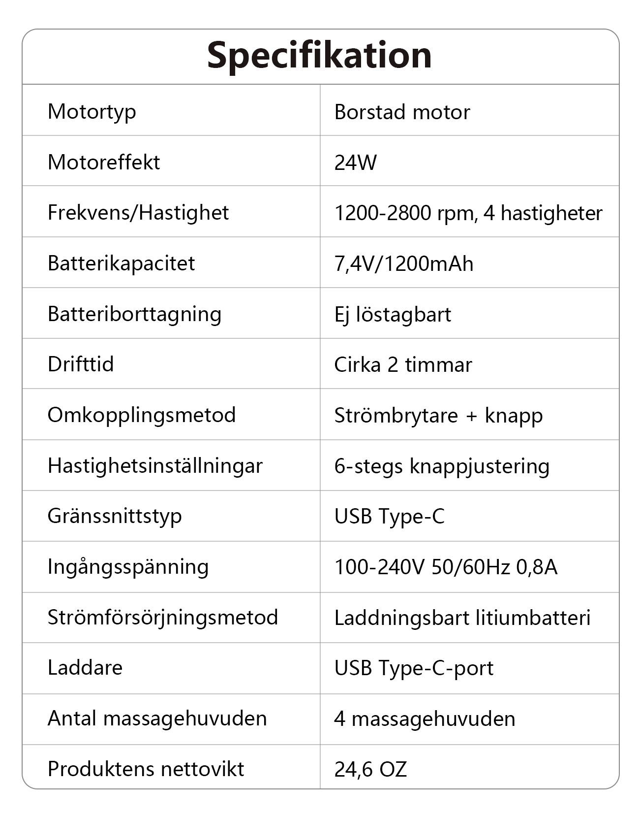 Det uppladdningsbara litiumbatteriet på 7,4 V och 1200 mAh ger stabil och långvarig prestanda under flera sessioner på en enda laddning. Njut av en avslappnande massage var du än befinner dig – på gymmet, på jobbet eller på resande fot. Med USB Type-C är laddningen enkel och smidig.