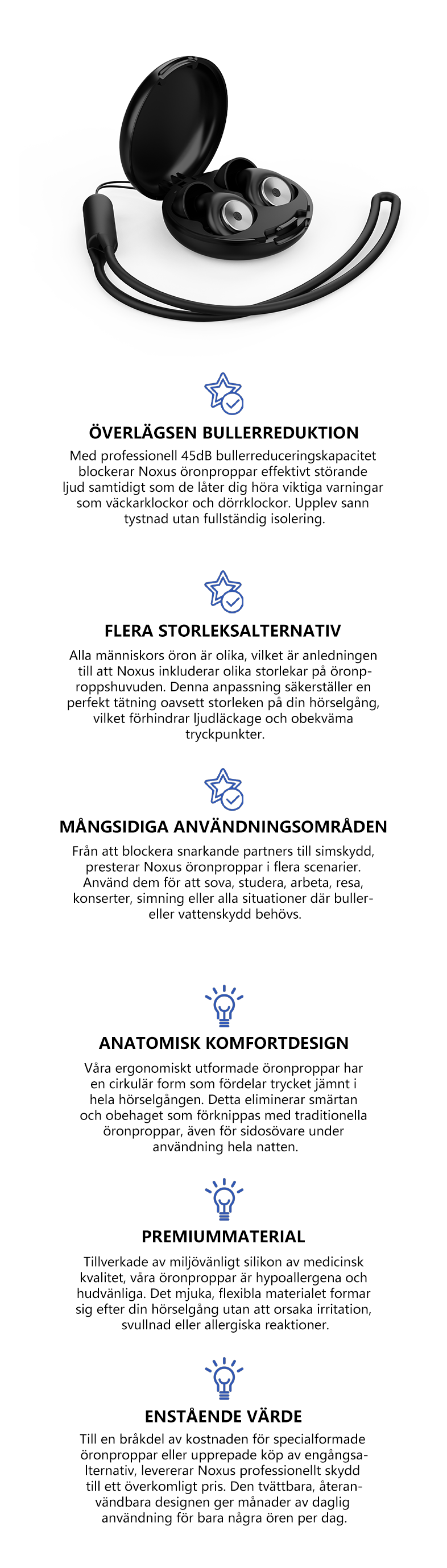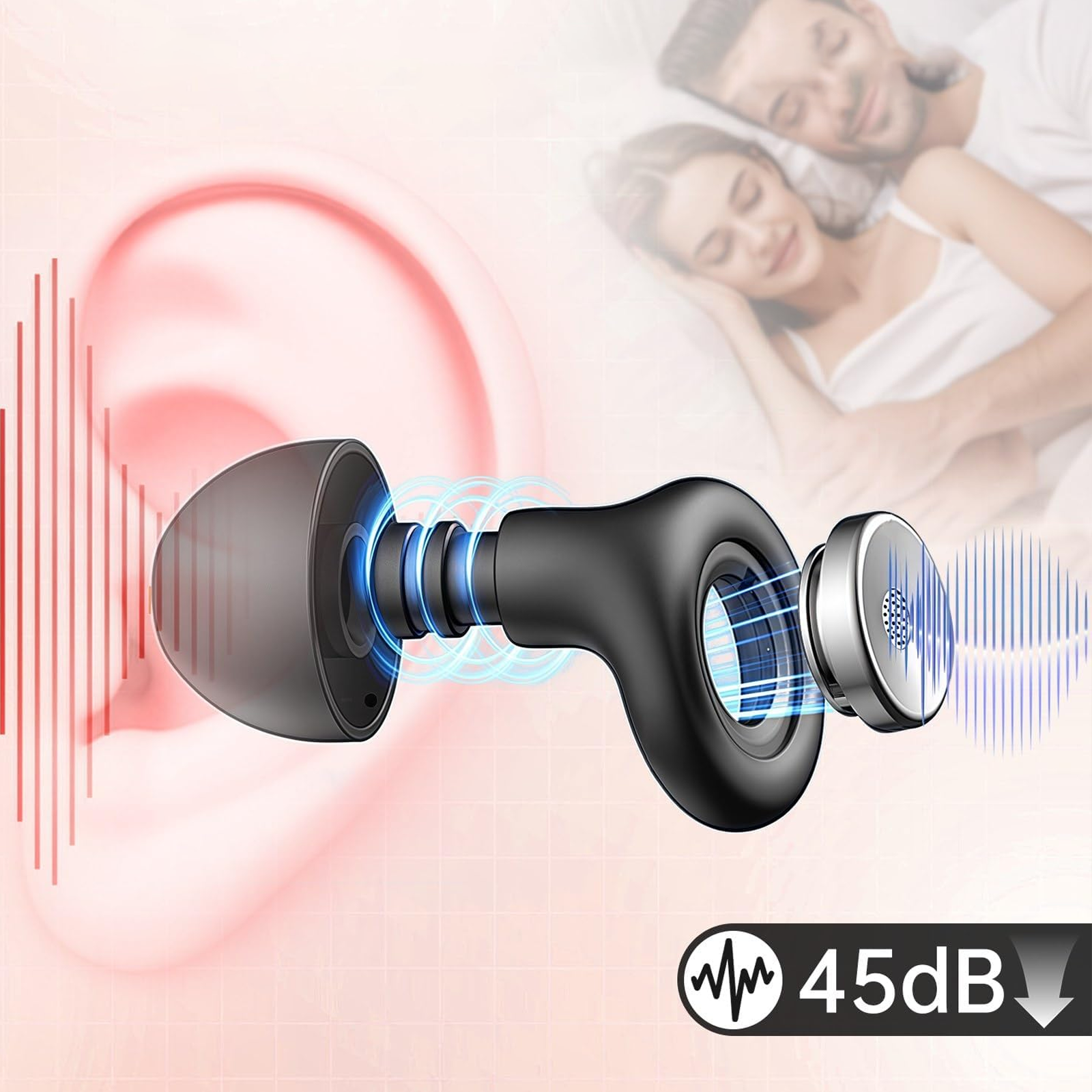 - Professionell brusreducering upp till 45 dB – Blockerar snarkningar, trafik och omgivande ljud för en djupare och ostörd sömn.