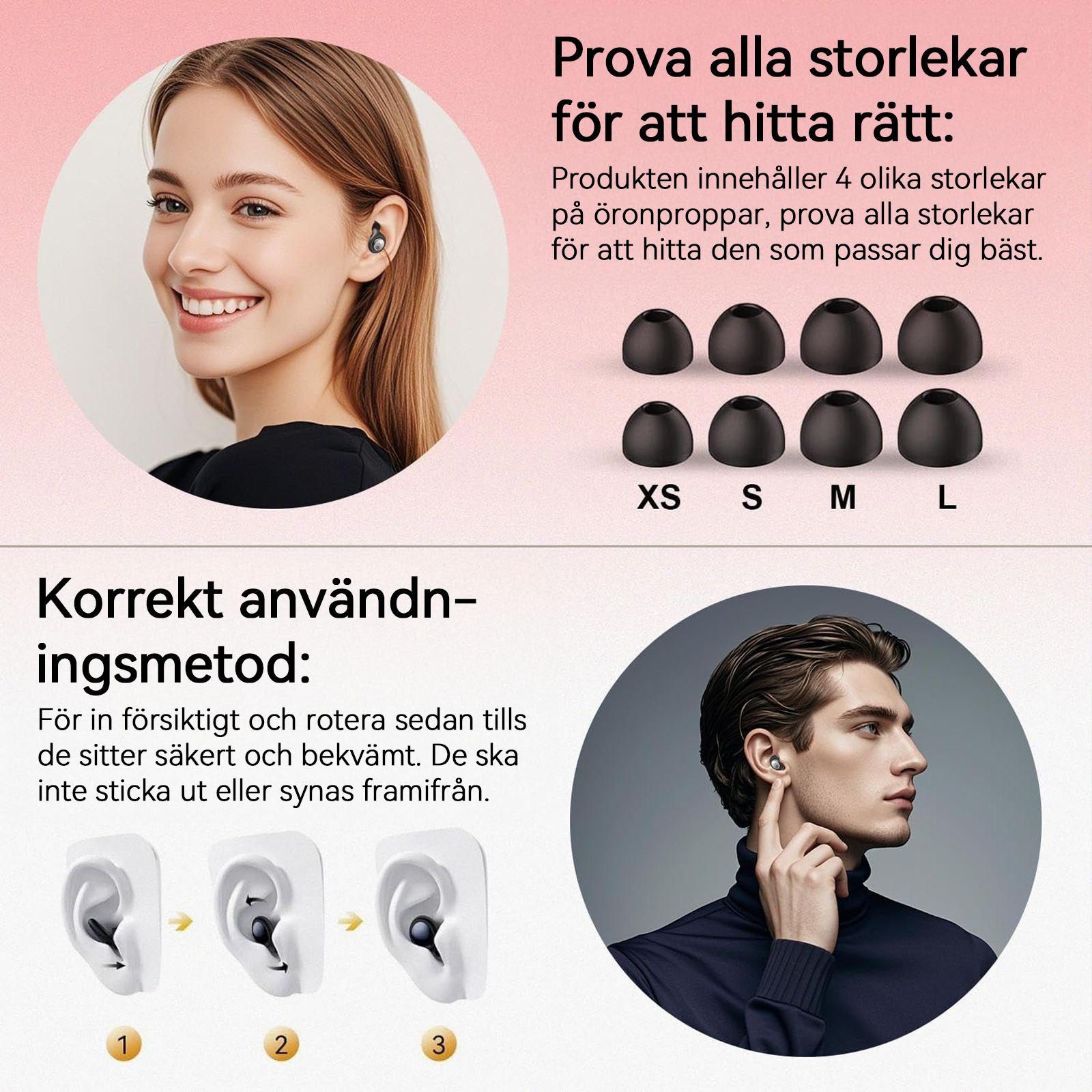 - Flera storlekar – Ger en säker, personlig passform för alla öronformer.